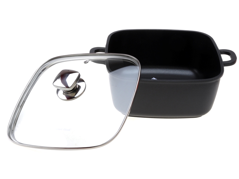Xoong nhôm vuông, đúc liền khối, phủ Titan và chống dính Teflon Platium siêu bền. Vung kính chịu nhiệt. Kích cỡ 24*11cm